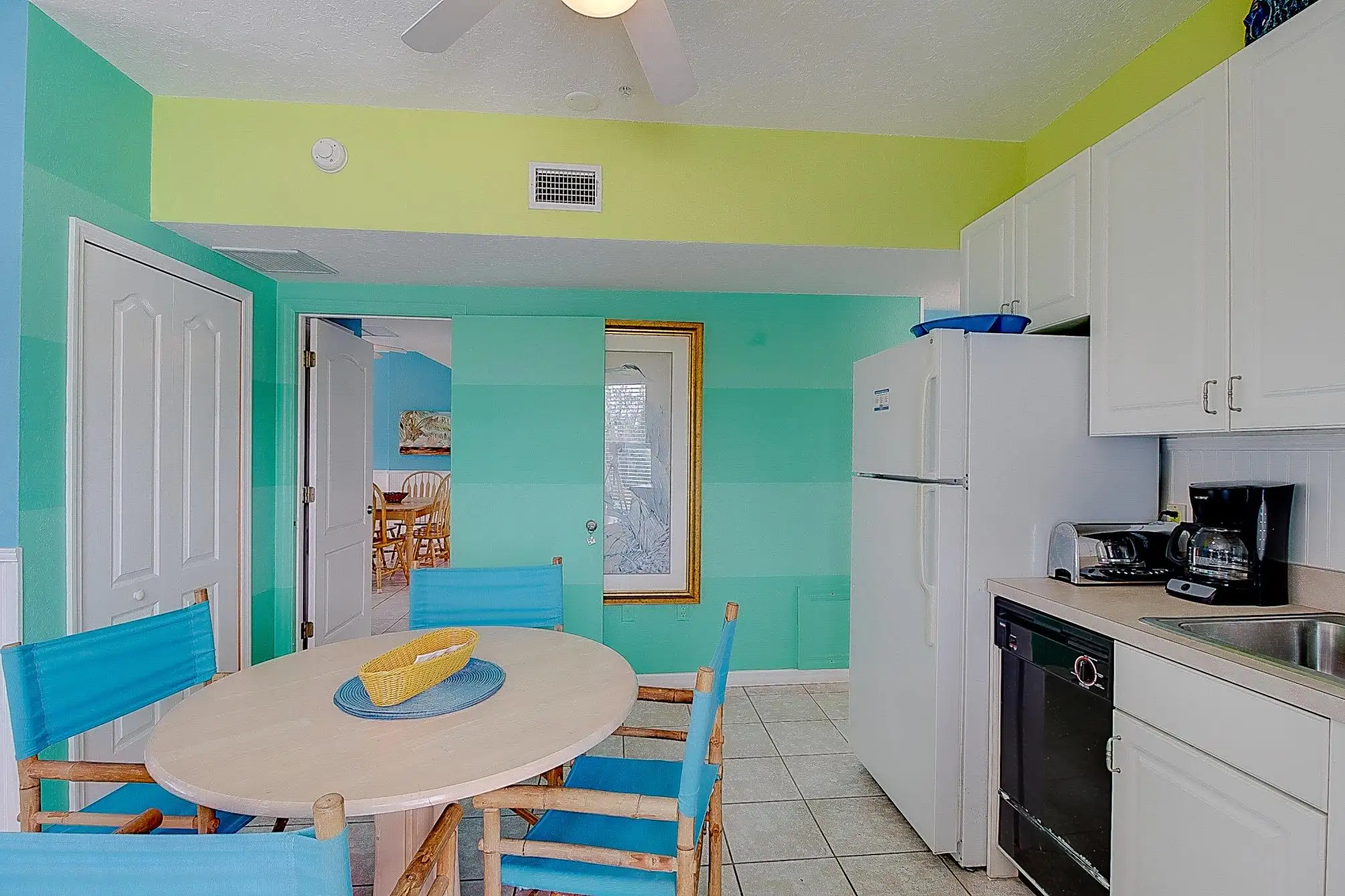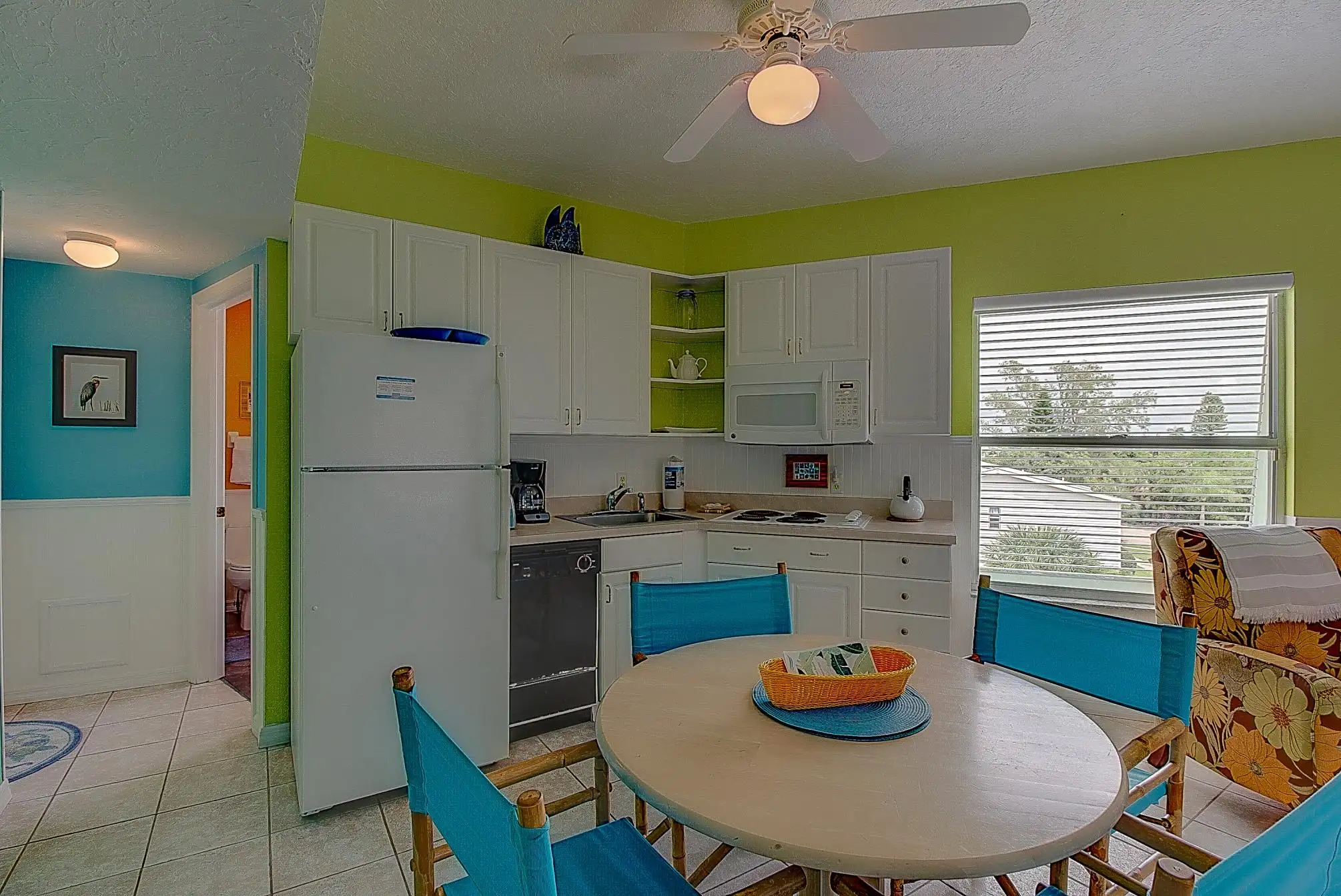 This vacation rental is perfect in size for a couple or single person. Full kitchen with ice maker, dish washer, wall mounted microwave oven and four burner cook top.